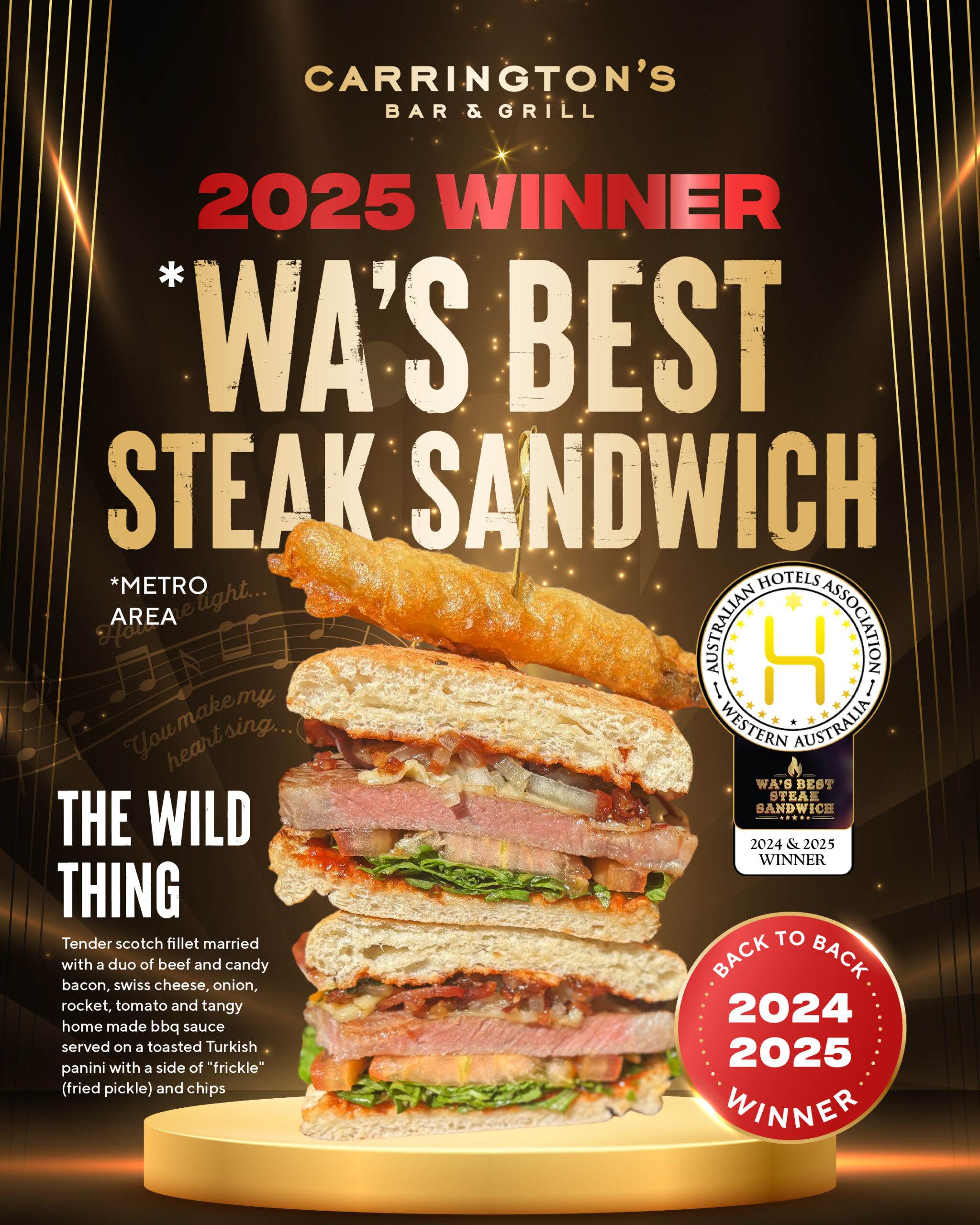 Recently awarded AHA’s WA’s Best Steak Sandwich 2024, it speaks volumes for what Carrington’s stands for supported by their best in class service from their great team of staff. Live music, quiz nights, meat raffles and many more activities guarantee patrons there is always good times to enjoy at Carringtons.